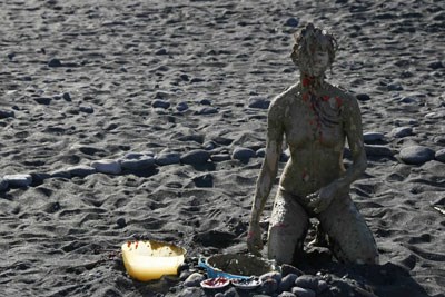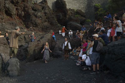 Le performance si svolgono in vari luoghi dell’isola, che ha solo uno spazio propriamente adibito, l’anfiteatro Eos; per il resto, utilizziamo spiagge, giardini, il vulcano: la natura diventa palcoscenico. E poi non ricorriamo all’elettricità, né per l’amplificazione della voce e degli strumenti musicali, né per l’illuminazione. Per cui sfruttiamo i meravigliosi tramonti di Stromboli, oppure la ricerca sperimentata in questi anni dal co-direttore artistico Hossein Taheri con fuoco, candele, lampade a gas naturale.