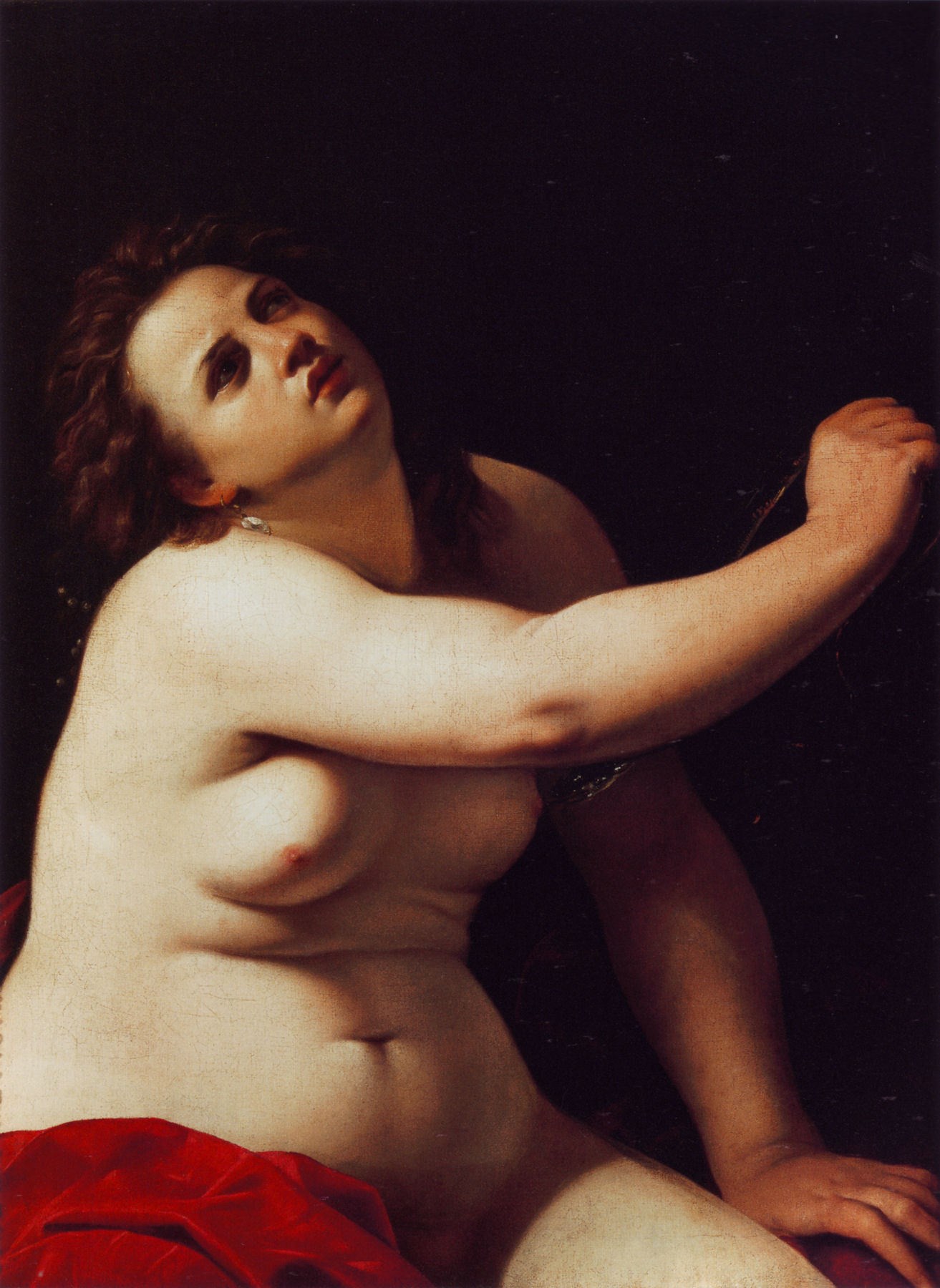 Sarà una festa barocca, stupefacente, di meraviglia alessandrina questa, portata in un piccolo paese della Tuscia dalla tela di Artemisia, mai sedata dal dolore dello stupro che subì e dalla vergogna dei successivi processi. C’è tutto un mondo di accecanti bagliori, languide carezze e violente passioni in questa Cleopatra, che data delle cortine vellutate del Seicento più che del sole d’Egitto. L’immagine, costantemente ripetuta dell’ultima dei Tolomei, è quella coeva alla pittrice, quindi nulla di filologicamente corretto sotto il punto di vista rigoroso della Storia, ma soltanto la leggenda di una morte tragica che si reincarna nell’età del Secolo d’Oro. Ma Artemisia-Cleopatra non è Caravaggio, né Guido Reni e neppure altre sue colleghe. È una donna di carne, di sangue, dilaniata da un morso d’antico aspide, dai fianchi muliebri ancora tardorinascimentali e ben poco incline ai nuovi dettami dell’immagine voluta dalla Controriforma. Un dipinto pagano, arcaico e come ogni opera d’arte antica, diventando un classico, si attualizza in una contemporaneità per molti impensabile. Perché davanti a un simile quadro si sospende il pensiero razionale e se ne cercano altri, fatti dell’abbraccio delle carni, della lussuria dei corpi, delle labbra dischiuse in un lieve gemito che può essere d’orgasmo come di morte.