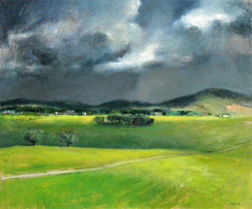 Pitture che provengono da un Io sommerso che non intende dichiararsi né apparire, come quello nascosto nell’intimo di “Campi gialli” e di “Colline a Saturnia”. Ampie aree di colore formano rilievi e depressioni in cui si distendono campi e coltivi reali, e i giochi ricurvi collinari sono fattori e generatori essi stessi del mosaico di colori. Campi larghi di colore, dove gli alberi sono macchie verticali casuali come la loro disposizione sul terreno, sistemati, radicati senza demos: spontanei come arbusti diritti e filiformi. Cieli densissimi eppure appena indicati: tutto passa dalla terra al cielo con una genuinità ingenua per cui si chiede all’Osservatore non un pensiero, ma una visione delle cose ferma e cristallizzata dalla semplice intuizione. Da terreni di ocra ai bellissimi verdi ricurvi, ora foncé ora pronti a sfidare le sfumature lacustri del pastello, emerge un coinvolgimento e un ringraziamento possente all’arte della Natura. E poi la riflessione cupa dell’Ulisse naufrago (come in “Mareggiata”; “Spiaggia a Castiglione”; “Spiaggia”) ospite di spiagge amare, con l’onda che genera l’andante solenne e molto mosso della sua sinfonia eterna.