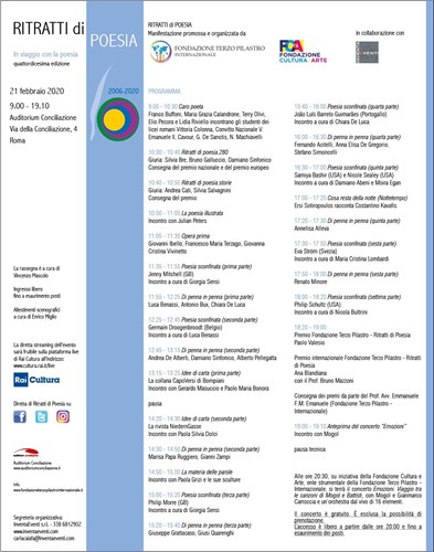 La XIV edizione della manifestazione internazionale “Ritratti di poesia” cambia sede, trovando spazio, quest’anno, nel foyer dell’Auditorium Conciliazione, a pochi passi dal Vaticano. La rassegna, unica nel suo genere, è stata ideata nel 2006 dal prof. avv. Emmanuele Francesco Maria Emanuele, Presidente della Fondazione Terzo Pilastro – Internazionale che, attraverso la Fondazione Cultura e Arte, promuove e realizza l’evento.