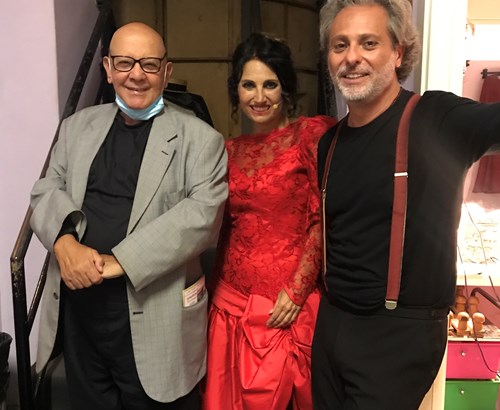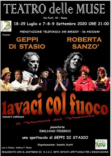 Geppi Di Stasio è attore, autore, regista dello spettacolo ed è direttore artistico del Delle Muse. Tante passioni scaturite da un solo amore, quello per il Teatro. Divide la scena e anche la vita con la bravissima Roberta Sanzò. Non sono infatti mancati i siparietti sulle note di brani del Cafè Chantant o le macchiette di Armando Gill. Anche brani intimisti come quelli di Pino Daniele, elegantemente accompagnati al piano da Emiliano Federici. Lavaci col Fuoco è uno spettacolo di Varietà che segue il precedente e fortunatissimo Voi non siete napoletani. Variegato e ricco di grande repertorio, cerca di coinvolgere gli spettatori in una festa di teatro puro, nudo, crudo, ma che, soprattutto, è uno spettacolo che cerca di emozionare con leggerezza. A fine spettacolo raggiungo Di Stasio in camerino preceduta da Lino Patruno il quale si congratula con gli attori e tutti insieme facciamo una chiacchierata distanziata: