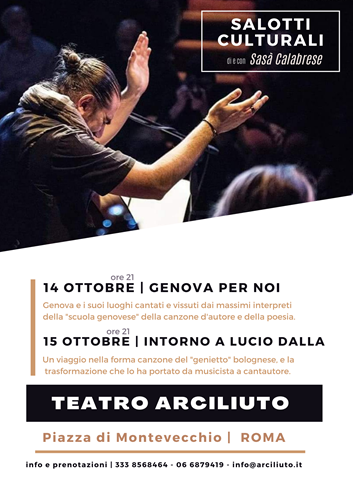 L’idea, che andrà in scena a due passi da piazza Navona, è di Sasà Calabrese. Il primo appuntamento, mercoledì 14 ottobre, si intitola “Genova per Noi”: è una passeggiata nella città della Lanterna, alla scoperta di chi è riuscito a renderla famosa. Quindi spazio a Gino Paoli, Luigi Tenco, Bruno Lauzi, Sergio Endrigo per citarne alcuni, artisti accumunati dalla scoperta della quotidianità, raccontando la realtà in modo alternativo.