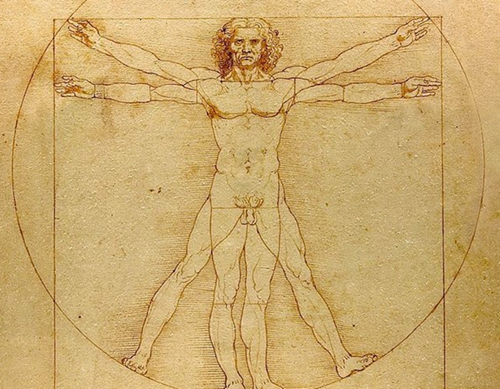 “È l’uomo vitruviano, simbolo per eccellenza dell’Umanesimo, che si proponeva come fine e misura ultima di tutte le cose. Il cerchio e il quadrato devono essere letti in chiave simbolica, anche sulla base delle riletture cristiane della teoria del microcosmo: il cerchio allude alla sfera divina, il quadrato al mondo terreno. L’uomo, a metà tra divino e terrestre, è un elemento di raccordo capace di unire i due mondi. È una sorta di commistione tra Umanesimo e Cristianesimo, che, pur rifacendosi alla tradizione degli antichi, individuava comunque nell’uomo l’immagine di Dio. Questo modo di pensare è ben esemplificato dal commento che appare sotto l’uomo vitruviano, che, tradotto dal latino, significa: “Colui che niente ignora mi creò. E io reco in me ogni misura, sia quelle del cielo, sia quelle della Terra”. L’uomo che è inscritto nel cerchio e nel quadrato è dunque la creatura capace di restaurare nelle cose e negli uomini l’armonia, il senso del divino e dell’unità con Dio”.