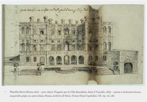 Lavora con l’erudito romano, amico intimo del cardinale Barberini, Antonio degli Effetti, che parla di lei nel suo libro “Discorso sullo Studiolo di pittura nella Galleria della Ricchezza”. Nell’Archivio di Stato a Roma sono raccolti sette disegni del Vascello a firma della Signora Plautilla Bricci architettrice. Nel 1675 viene incaricata dal papa Urbano VIII di creare lo stendardo processionale su una tela grande, dipinta su entrambi i lati. Il suo stile si sviluppa tra il classicismo e il barocco con un successo personale che le è stato possibile grazie alla sua abilità di muoversi nel difficile momento storico di una Roma invischiata nelle lotte fra differenti visioni politiche, artistiche e culturali.