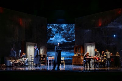 Anche qui, come in molte opere russe, c’è Il’ja Afanas’evič Šamraev (Gennaro Di Biase), il fattore che si ingrassa e che maltratta sua moglie Polina Andreevna (Angelica Leo), con una figlia Maša (Enrica Cortese è poi bravissima con il suo inserto musicale), data in sposa a Semen, un maestro squattrinato, che ragiona come un contabile ossessionato dalle truffe. E, poi, c’è Lui, Boris: il signor demonio travestito da scrittore di successo che agisce come un vampiro opportunista, facendo innamorare perdutamente di sé Nina, per poi abbandonarla dopo averle dato un figlio morto prematuramente, condannandola così a un’esistenza di attrice girovaga di terzo ordine, con la vita distrutta. Ed è Nina ad apparire nel finale proprio come il Fantasma, per aver regalato la creatività della scrittura a Kostantin, che rinuncerà a quel dono, togliendosi la vita per amore suo.