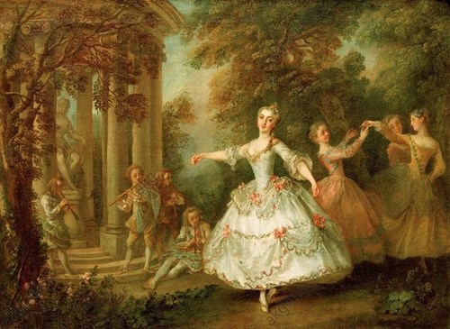 Jean-Baptiste Pater, allievo di Watteau, dedica numerosi dipinti a scene di danza aristocratica. Nei suoi quadri il minuetto è spesso riconoscibile: coppie che si fronteggiano, passi controllati, un’atmosfera di festa composta. La pittura diventa una partitura silenziosa, dove ogni figura occupa il suo posto con precisione.