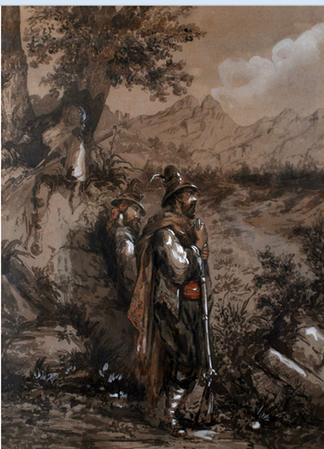 La lista dei pittori di tale umanità è molto ricca e cosmopolita tra cui Schnetz, Navez, Coignet, Michallon, H. Vernet, gli avamposti e cantori dei briganti autentici… ma chi va considerato quasi lo scopritore, comunque il più appassionato e maggior diffusore e illustratore sia dei briganti principalmente e anche delle donne ciociare fu Louis Léopold Robert, svizzero (1794-1835) e francese, poco più che ventenne. Visse parecchi anni a Roma per poi trasferirsi a Venezia. Iniziò dapprima attirato dalla curiosità a dipingere le donne deportate alle Terme di Diocleziano e qui fece la conoscenza di due sorelle: Maria Grazia Boni, giovanissima, già sposata ad un brigante morto ammazzato in qualche scontro con la gendarmeria, e Teresina, più giovane, con la quale ebbe un rapporto. Altri artisti presero ad interessarsi sia delle due donne, sia dei briganti e intrapresero anche loro la via di Sonnino. E nacque quella che gli artisti belgi definirono la pittura di genere all’italiana, un capitolo significativo dell’arte occidentale, la ripresa dei briganti e delle donne e delle scene di vita; fu non solo la prima volta che si ammiravano nei quadri le figure dei briganti e delle contadine nelle loro vestiture, si assistette all’apparizione degli ultimi della scala sociale passati ora al primo piano nel quadro! Fu la prima volta nella storia della pittura europea che gli ultimi della società occupavano il posto delle Veneri, di Apollo, dei grandi paesaggi, delle nobildonne, eccetera. Fu l’inizio della fine della cosiddetta “accademia”. E venne il successo che dovette durare fino alle prime decadi del Novecento: i quadri iniziarono ad apparire nelle città europee, già dal 1815, a Parigi, Monaco, Berlino, Bruxelles, con briganti nei loro cappellacci a punta e il fucile a trombone, scene di assalto ed agguati, belle contadine nel costume ciociaro. Parallelamente, si consolidò e evolse la professione delle modelle e modelli: di Maria Grazia in special modo apprendiamo che posava con alti riconoscimenti all’Accademia di Francia molto apprezzata da Victor Schnetz, direttore della scuola: qualche voce racconta essere la modella più bella di Roma.