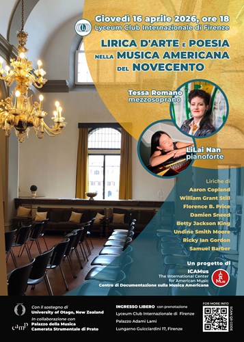 Lirica d’arte e poesia nella musica americana del Novecento. Sarà il tema centrale del pomeriggio culturale organizzato dalla sezione musica del Lyceum Club internazionale di Firenze presieduto da Elenora Negri. L’evento, organizzato con il sostegno della Croce rossa fiorentina e da Centrica Imagine more, si terrà giovedì 16 aprile, alle 18 al Palazzo Adami Lami. Si tratta di un’occasione imperdibile in cui si rinnoverà anche la collaborazione con ICAMus, The International Center For American Music. L’iniziativa di alto profilo coinvolgerà anche la University of Otago (Nuova Zelanda) e il Palazzo della musica camerata strumentale di Prato. La proposta di lirica da camera, scritta da compositori statunitensi di ieri e di oggi, sarà interpretata dal mezzosoprano statunitense Tessa Romano e dalla pianista cinese LiLai Nan. Il pubblico che interverrà in sala viaggerà tra musica e poesia dal Novecento a oggi, ruotando intorno a un tema centrale: la natura e la società.