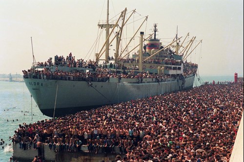 La storia della Vlora ha molto in comune con le bananiere oggi in disarmo: il 7 agosto 1991 la nave entrava nel porto di Durazzo, era di ritorno da Cuba dove aveva caricato zucchero. Dopo le operazioni di sbarco del carico nel porto albanese, 20mila persone convincevano il comandante Halim Milaqi a salpare per l’Italia. Halim Milaqi complice o convinto da qualcuno importante? Gli interrogativi sulla Vlora rimangono tutti. Dopo quella prova di forza iniziarono le emigrazioni di massa dall’Albania verso l’Italia: particolare non secondario è che tutti gli albanesi erano numericamente inferiori agli abitanti di una media regione italiana. Anche l’ingresso al porto presentava similitudini con l’ingresso delle navi delle Ong: il capitano Halim Milaqi forzava il blocco portuale comunicando di avere “feriti gravi a bordo e di non poter fare marcia indietro a causa del grande carico”.