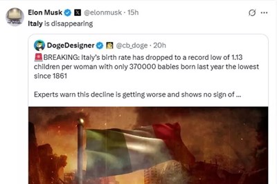 Elon Musk, sul proprio social X, ha commentato un post del profilo Doge Designer con un perentorio “L’Italia sta scomparendo”, con tanto di bandiera italiana in fiamme. I dati impietosi sulle nascite, purtroppo, non possono dargli torto.