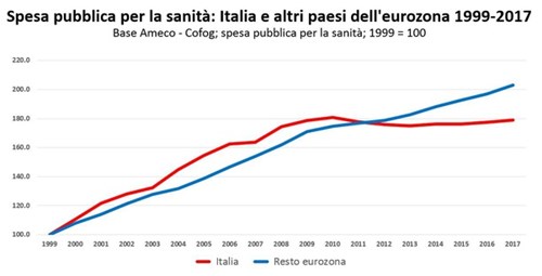 Vediamo che la nostra spesa sanitaria a) può ancora crescere, anche più che nell’Eurozona, fra il 2003 ed il 2006; b) diminuisce fra il 2006 ed il 2007, c) si riprende poi sino al 2010, d) ma infine si sgancia rovinosamente dall’Eurozona a partire appunto dal 2011. Visto che le analisi correnti (incolpanti burocrazia, evasione-elusione, opinioni politiche ecc.) disdegnano di calarsi nella cronologia e di correlarsi ai suoi dati di fatto, è ora di considerare meglio la coincidenza cronologica con l’oscillazione dell’atteggiamento nazionale verso un elemento che già ci è stato facile utilizzare nell'articolo sopra-linkato: a) nel 2003 il ministro delle Attività produttive, Antonio Marzano, decreta di ri-autorizzare l’Enel a costruire centrali nucleari all’estero, superando uno dei responsi referendari del 1987, e recuperando così quelle competenze poi riutilizzabili anche in Italia; b) nel 2006 Alfonso Pecoraro Scanio inserisce nelle 180 pagine del programma del Governo Prodi il rifiuto dell’energia nucleare; c) la quale viene invece rilanciata nel programma opposto vincente nel 2008 con maggioranza mai vista più dai tempi di De Gasperi, attuato poi da tale Parlamento (su ciò competente secondo la sentenza della Corte costituzionale riportata nell’articolo linkato) con la legge n. 99 del 2009; d) contro la quale legge nel 2010 dipietristi e grillini avviano la raccolta di firme per un referendum abrogativo (inammissibile secondo l’articolo 75 della Costituzione, e poi ammesso solo perché limitato dalla Corte stessa, ed anzi capovolto nel suo opposto); assurdamente, quel referendum nel 2011 sembra avere abolito il nucleare italiano, secondo l’opinione corrente, determinando non solo il crollo della nostra capacità sanitaria, ma anche di quella economica in generale.