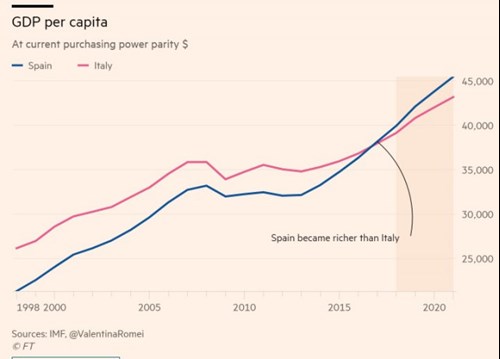 Essere autorizzati oggi a far più debiti, in deroga al patto di stabilità europeo, certo non vuol dire attrarre investimenti privati nella nostra economia reale, come avevamo fatto mirabilmente nel biennio felice 2009-2010. Al contrario: in vista degli enormi investimenti necessari nel prossimo futuro, dobbiamo deciderci a capire che (a parte le nostre riserve auree, i risparmi privati e gli altri beni ovviamente aggredibili dai creditori) l’Italia non ha più soldi pubblici per difendere la propria economia e la propria sanità. Ogni ulteriore debito andrebbe addizionato agli 80 miliardi che già spendiamo annualmente per coprire gli interessi su quel che ci viene prestato, d’ora in poi comunque in crescita insieme allo spread dei nostri interessi rispetto a quelli dei tedeschi, sebbene frenato da altri prestiti, sui quali riparte “altro giro, altro regalo” della stessa spirale. Non ce la facciamo più a buttare altri soldi. Come li può invece sparare la Germania, subito raddoppiati dagli Usa, mentre la Francia può pensare ad una IRIzzazione delle sue industrie, che noi avevamo invece dovuto de-IRIzzare, cioè svendere, ai passeggeri del Britannia attraccato ghiottamente a Civitavecchia a seguito del primo dei due referendum che abbiamo voluto sbandierare come antinucleari. E questi sono i tre Paesi che hanno già assorbito il massimo delle nostre delocalizzazioni, come si vede nella tabella a pagina 16 del secondo link citato. Ad imitarci seriamente nelle nostre misure restrittive è il quarto risucchiatore: la Spagna, che è diventata più competitiva di noi dopo quel disgraziato 2011, sino a sorpassarci nel reddito pro capite, come riporta il Financial Times dal Fmi: