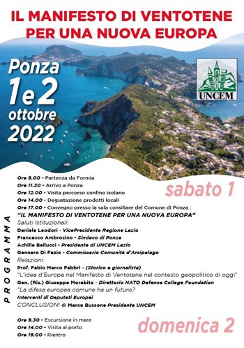 Un convegno internazionale sull’Europa. Il primo ottobre, nell’isola di Ponza, l’Uncem nazionale (Unione nazionale comuni, comunità ed enti montani) analizza l’eredità del “Manifesto di Ventotene”, ma osserva anche il quadro del Nuovo ordine mondiale. I relatori dell’incontro sono lo storico e giornalista Fabio Marco Fabbri e il generale Nato Giuseppe Morabito. Il primo tratta del nutrimento ideologico che ha influenzato lo spirito dei padri del “Manifesto di Ventotene”, dal punto di vista ideologico e geostrategico, affondando poi le sue analisi sulla proiezione che il Manifesto ha avuto alla luce del Nuovo ordine mondiale.