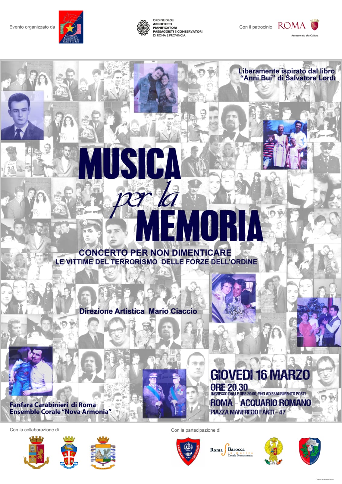 L’obiettivo è quello di trasformare tale giornata da un evento tragico e luttuoso per tutto il Paese in una giornata che possa diventare lieta e di speranza. La serata, che si inserisce tra le iniziative ufficiali per la rievocazione di questa importante ricorrenza, mette in scena una singolare fusione tra la Fanfara dell’Arma dei carabinieri e i racconti dei familiari delle vittime delle Forze dell’ordine uccise per mano terroristica. Grazie al libro “Anni Bui – storie sconosciute di uomini in divisa ammazzati dal Terrorismo, dal 1956 al 1980”, scritto da Salvatore Lordi (che racconta, in una sorta di diario, le vite intime e familiari di mogli, figli, fratelli dei tanti poliziotti, carabinieri, finanzieri uccisi per mano dei terroristi), la Fanfara dell’Arma musicherà per l’occasione i brani che furono il “leitmotiv” di uno scampolo di vita che costoro vissero insieme.