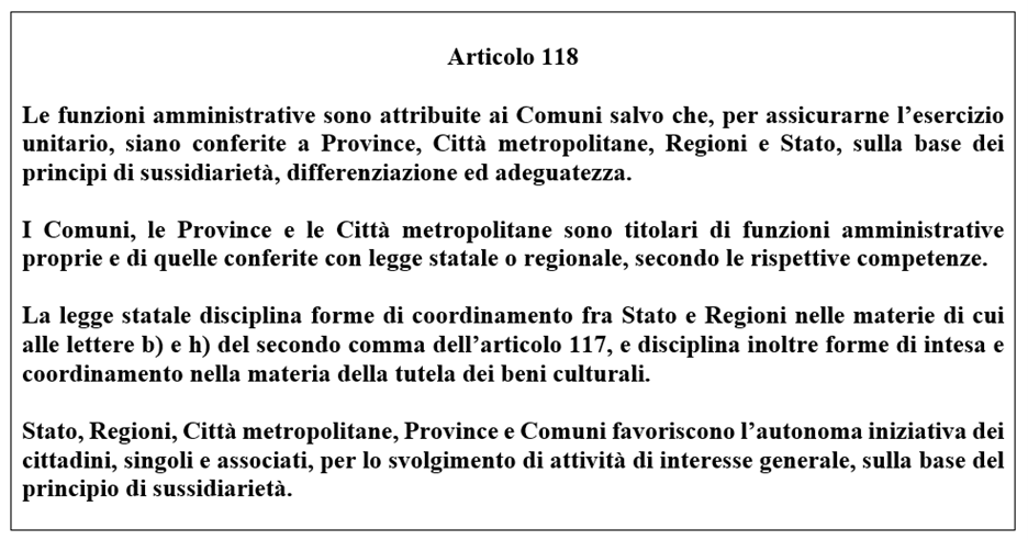 Questo approccio, sempre secondo Anna Finocchiaro, è la lezione dell’articolo 118 della Costituzione, IV comma, sul principio di sussidiarietà orizzontale. Nei commi precedenti al quarto si descrivono gli attori, le competenze, i ruoli e i reali spazi operativi per poter incidere su scelte e su azioni che avvengono su un ambito territoriale, direttamente ed indirettamente vissuto giornalmente da chi vive e fruisce un determinato spazio “costruito e non costruito”.