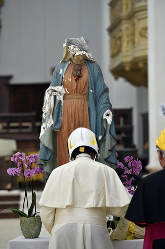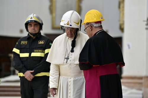Quindi Bergoglio ha indossato un casco bianco da cantiere, è entrato nella Cattedrale di Santa Maria Annunziata (inagibile e lesionata) ed ha deposto un mazzo di fiori dinanzi alla Madonna della Misericordia. Insomma, una visita ristretta agli addetti ai lavori, i sindaci dei Comuni dell’arcidiocesi di Camerino-San Severino Marche, il cardinale Edoardo Menichelli (arcivescovo emerito di Ancona), alti prelati, assessori, vertici locali della Croce Rossa. Mancava la gente, quelle folle a cui Bergoglio è stato abituato. Del resto le Marche sono ormai spopolate, i borghi versano nell’abbandono e le fabbriche sono ormai cattedrali nel deserto.
